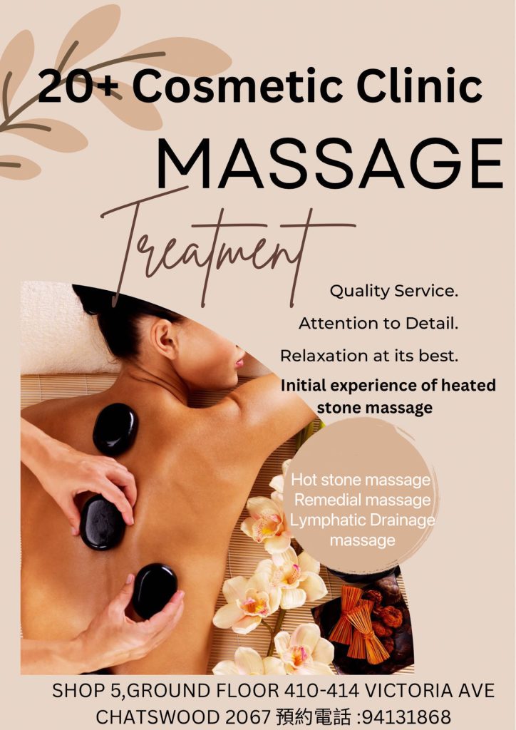 Tailored Massage Treatments At 20+ Cosmetic Clinic, we tailor each massage to your individual needs. Our therapists, all diploma-qualified with additional specialised training, ensure you receive a personalised treatment – no cookie-cutter massages here!